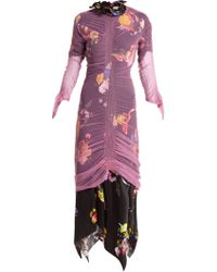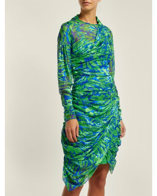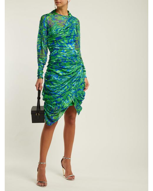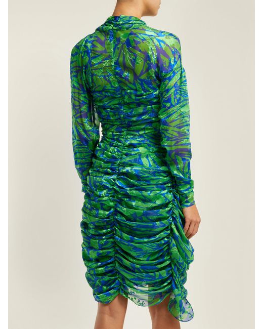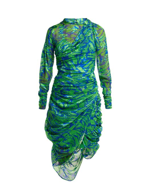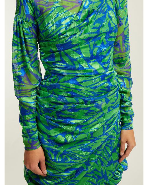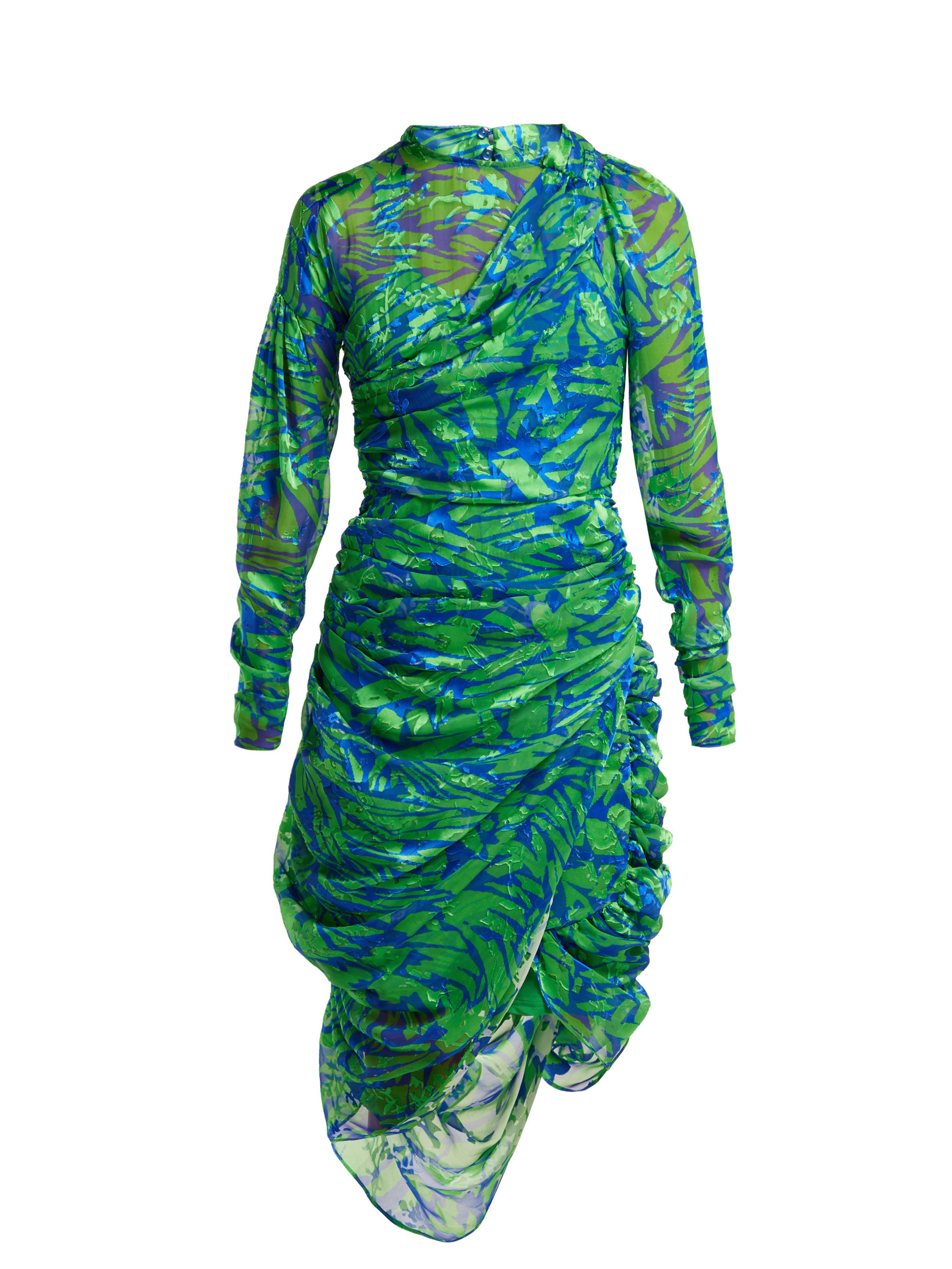 Appearing in Preen by Thornton Bregazzi's Resort 2019 lookbook, this green silk-blend Lynn dress is enlivened with a blue jungle print inspired by the UK's 1990s rave scene. It's crafted from airy devoré chiffon with ruching along the sides, cuffs and back for a softly gathered effect, then ends in an asymmetric hem. Keep the statement pattern in focus by teaming it with understated accessories. MAIN: 56% SILK, 44% VISCOSE. Colour: green