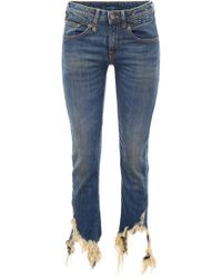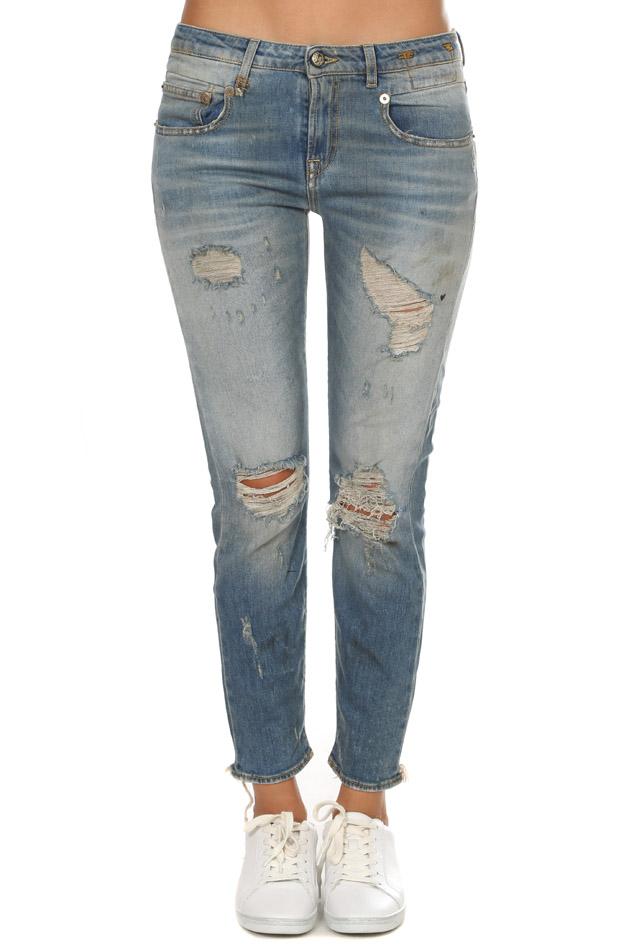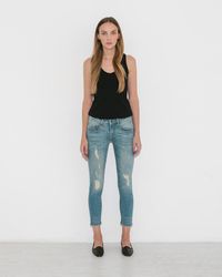 Nbsp;Shredded holes throughout bring a personalized authenticity to these ankle length skinny jeans. Faded denim with a light stretch lends a worn and broken-in edge. 98% Cotton 2% EA. Made in Italy. Machine Wash Cold. Model is 5'9" wearing size 27. Colour: blue