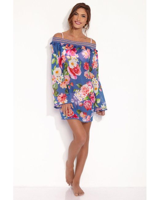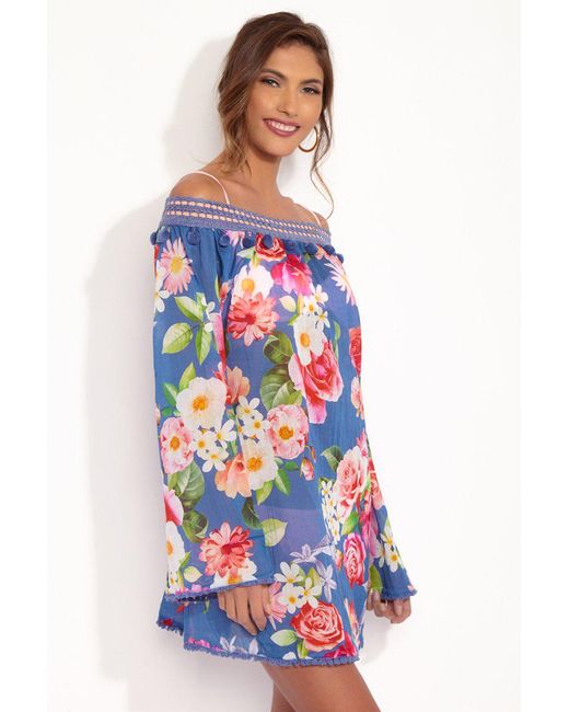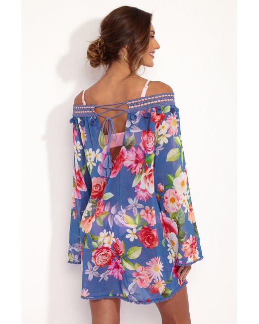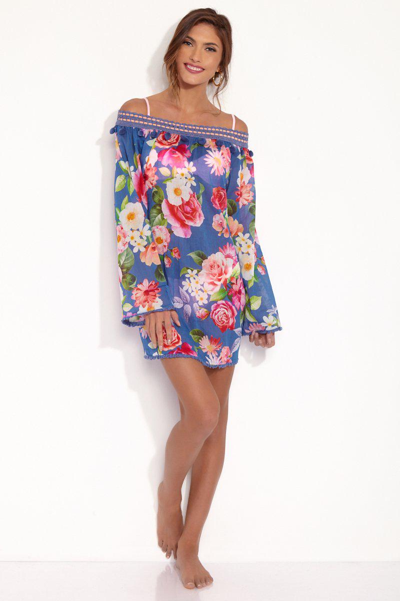 STYLE: Deep blue floral print adjustable tie back off the shoulder long-sleeved A-line kaftan with crochet pom-pom neckline and tassel trim details. Made of soft laundered cotton voile, the vivid bright pink and cream floral print pops off the deep blue background fabric beautifully, giving this kaftan bold contrast that is sure to turn heads. Handmade details such as the crochet off the shoulder neckline and delicately beaded tassel trims on the hems give a sweet boho chic look. Fully adjustable lace-up crochet panel that ties in the back means you can be sure to find the perfect fit every time. This romantic pretty kaftan is perfect to take from a breezy day at the beach to a dinner date at night. Team with the Chloe Bralette and the Chloe Cheeky Bottom for the perfect beachwear match. CARE: Fabric – 100 % Cotton. RiniKini crochet swimwear constructed of high-quality fabrics and yarns that are delicate in nature. The bikini can be worn in a pool or seawater. However, after use, all swimwear should be hand washed in cold water with very mild soap and then laid flat to dry. Colour: blue