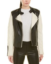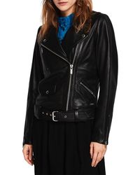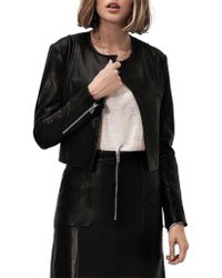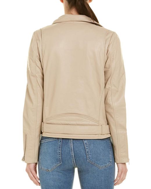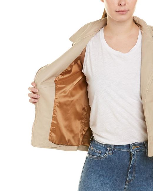 Color/pattern: sand. Approximately 21in from shoulder to hem. Measurement was taken from a size small and may vary slightly by size. Design details: notch lapel, four front pockets, zippered cuffs, belted hem. Asymmetric zipper front. Shell: 100% lamb leather. Lining: 100% polyester. Sleeve lining: 97% polyester, 3% elastane. Clean by a leather expert.