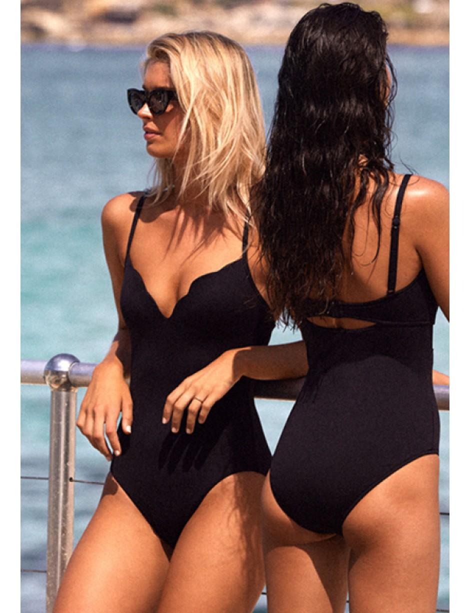 For a chic look choose the Petal Sweetheart Swimsuit in Black from swimwear designer Seafolly. This one piece features a super flattering petal edge neckline, with soft padded cups and adjustable shoulder straps to create the perfect fit. Colour: black