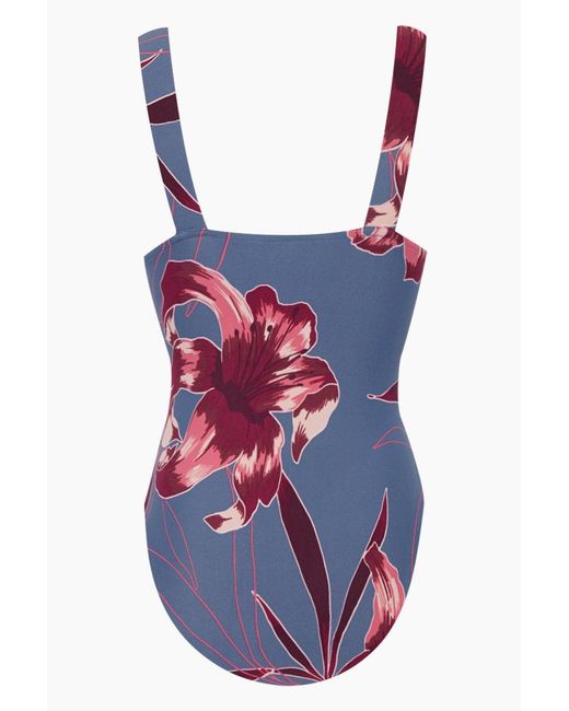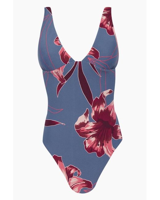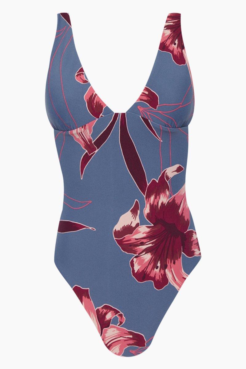 STYLE: Deep V one-piece swimsuit in blue-grey floral print. Classy cool grey stretch swim fabric with maroon and pink toned large floral print. Deep V neckline with long triangle cut shows off your decolletage while thick shoulder straps offer a comfortable and supportive fit. Mid-rise design with moderate backside coverage shows off your curves without showing too much skin. Pair this one-piece swimsuit with a flowy sarong and flats for a sophisticated beach look. CARE: Cold gentle machine wash separately or hand wash with lukewarm water using a mild detergent and dry in the shade. Nylon / Spandex blend. Vendor SKU: 10860-S636. Colour: grey