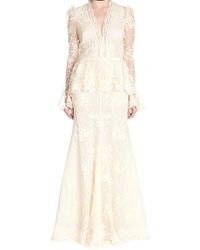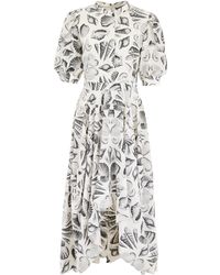 Self-Portrait deconstructs the evening dress with this asymmetric dress. The glamorous fashion rules behind the wrap dress are broken here with a sensual bare shoulder. The draped waist structures this deep emerald green piece. Wear this unique dress with white slingbacks.