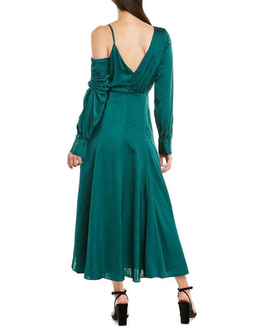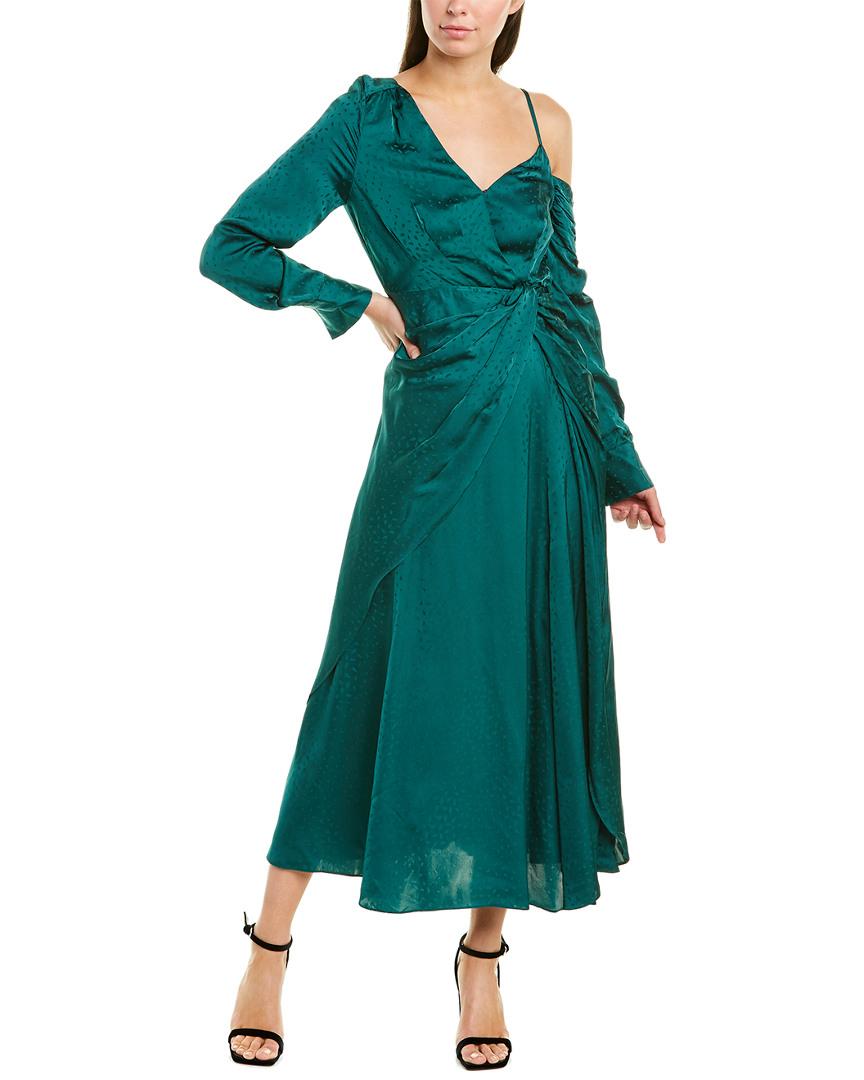 Color/pattern: green Approximately 52in from shoulder to hem Measurement was taken from a size 4 and may vary slightly by size Model is 5ft 10in Design details: asymmetric shoulders with adjustable left strap and ruching, button cuffs, gathered left waist, layered skirt with thigh slit at front left hem Center back zipper with hook-and-eye closure Shell: 100% viscose Lining: 100% polyester Dry clean only Imported.