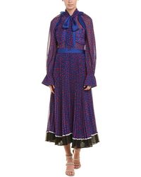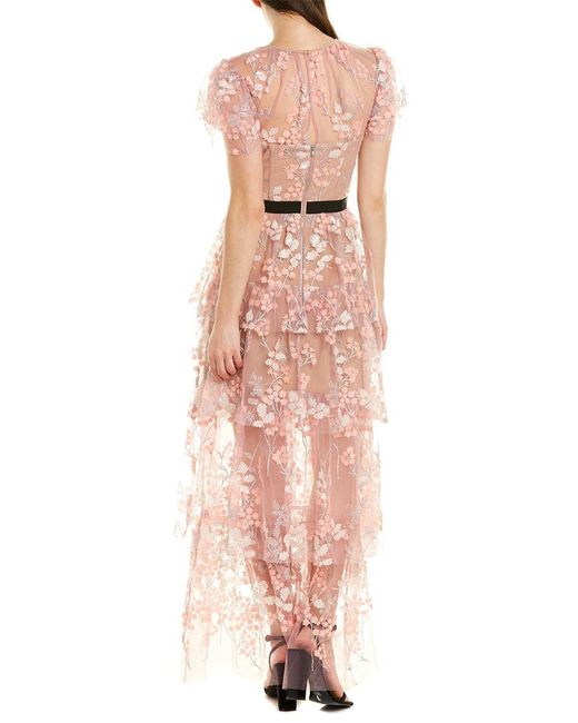 This item tends to run small (based on Member feedback). We recommend sizing up for your best fit. Color/pattern: pink. Approximately 59in from shoulder to hem. Measurement was taken from a size 4 and may vary slightly by size. Model is 5ft 10in. Design details: embroidered mesh design with sequined floral detailing, sheer neckline and puff sleeves, bustier-style bodice with underwire support and light boning, tiered ruffle skirt. Center back zipper with hook-and-eye closure. Shell: 92% polyester, 8% metallized fiber. Waistband: 100% viscose. Lining: 100% polyester. Dry clean only.
