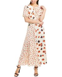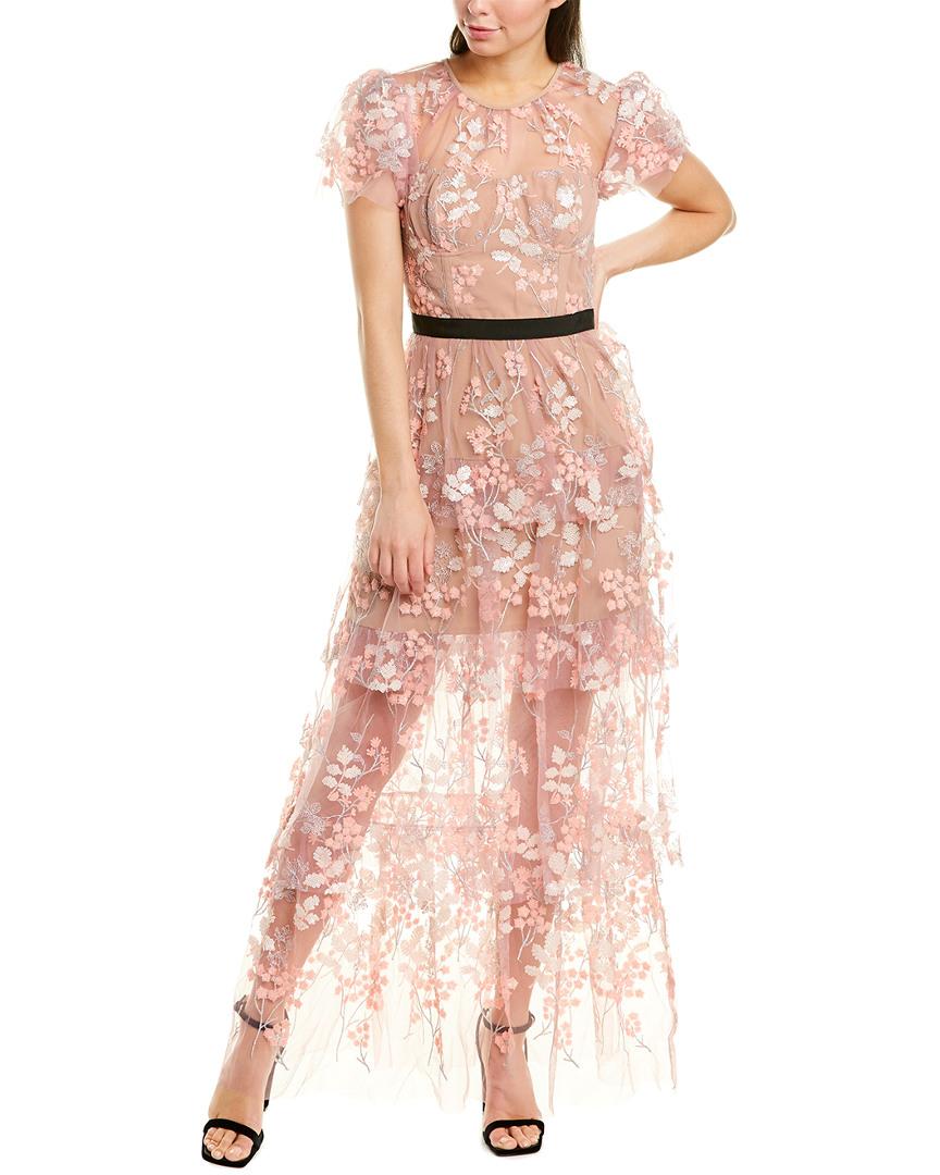 Color/pattern: pink Approximately 59in from shoulder to hem Measurement was taken from a size 4 and may vary slightly by size Model is 5ft 10in Design details: embroidered mesh design with sequined floral detailing, sheer neckline and puff sleeves, bustier-style bodice with underwire support and light boning, tiered ruffle skirt Centre back zipper with hook-and-eye closure Shell: 92% polyester, 8% metallized fibre Waistband: 100% viscose Lining: 100% polyester Dry clean only Imported. Colour: pink