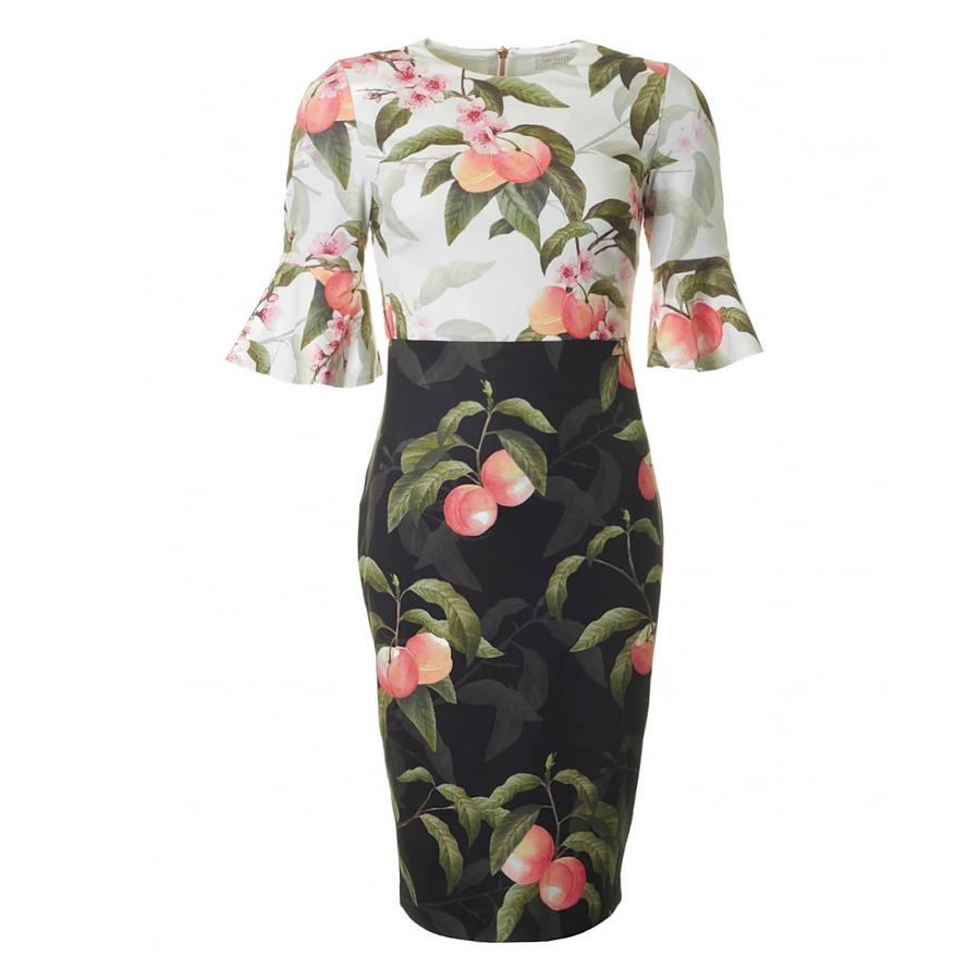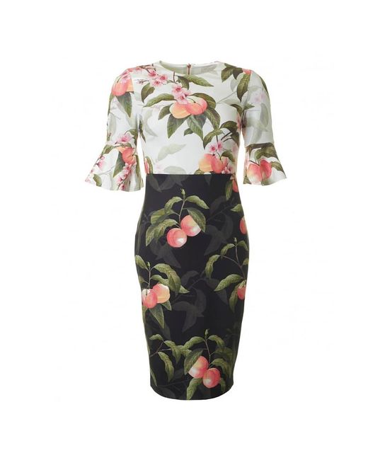 Dress to impress at your next special occasion with areea. Showcasing ted's peach blossom floral print in contrasting colours, it has elegant fluted sleeves and a bodycon fit. Ted baker womenswear collection. Peach blossom floral print. Bodycon. Fluted three quarter-length sleeves. Lined bodice. Dress length from neck to hem: 106cm. Our model is 5'9" and wears a size 2. Fabric content: shell: 96% polyester, 4% elastane; upper lining: 94% polyester, 6% elastane. Care information: do not wash, dry clean only.