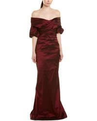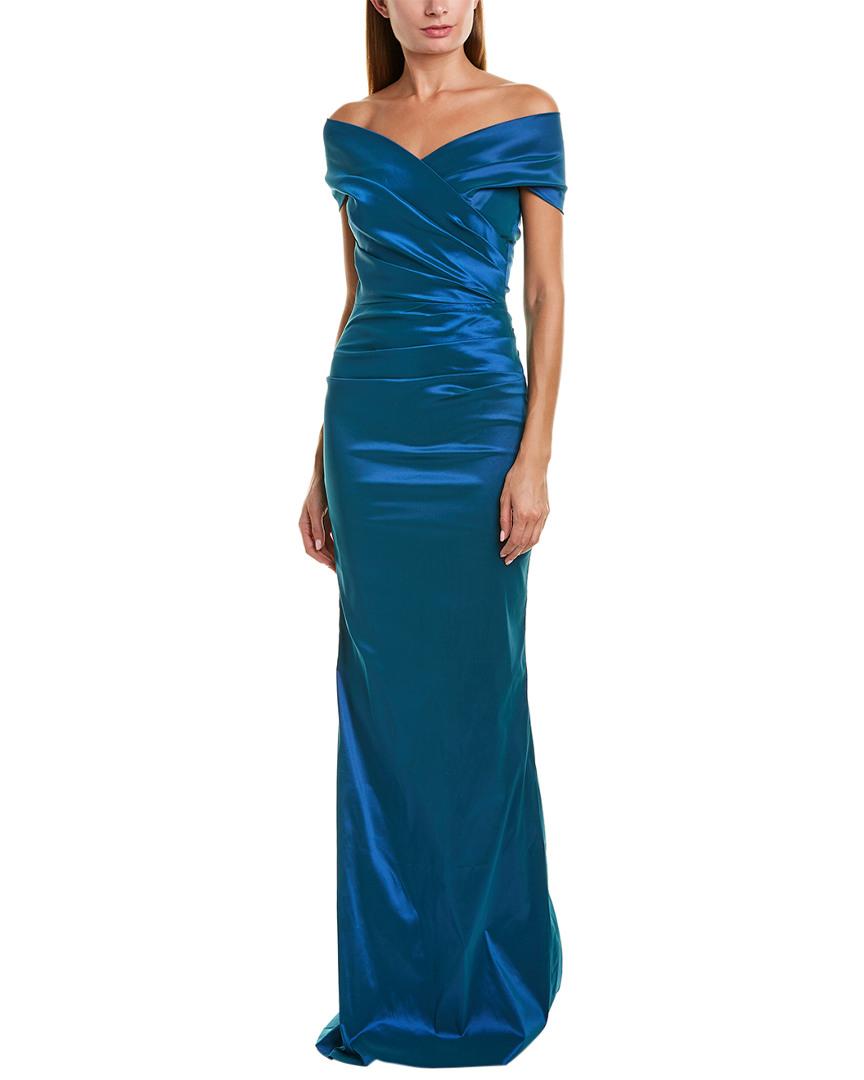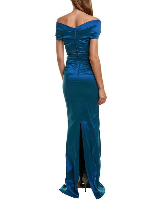 Color/pattern: azure Approximately 60in from shoulder to hem Measurement was taken from a size 4 and may vary slightly by size Model is 5ft 10in Design details: off-the-shoulder ruched design, centre back slit at hem Centre back zipper with hook-and-eye closure 94% polyethylene, 5% nylon, 1% elastane Dry clean only Imported. Colour: blue