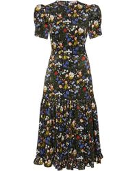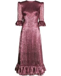 Taking its name from the founder's abandoned book project, The Vampire's Wife offers an offbeat twist on retro glamour. This metallic green silk blend Veneration leaf-print midi dress from The Vampire's Wife features a round neck, a concealed rear zip fastening, three-quarter length sleeves, puffy shoulders, flared cuffs and a ruffled hem. Material:Silk/Microfibre. Colour: green