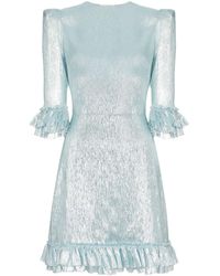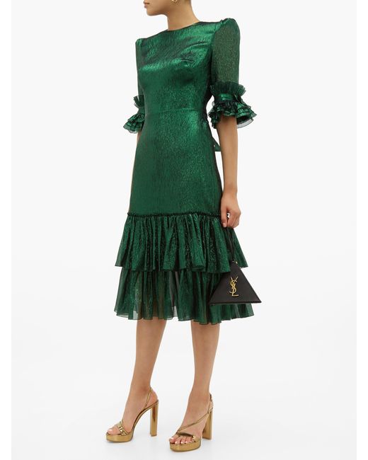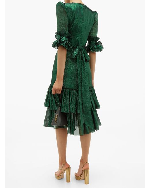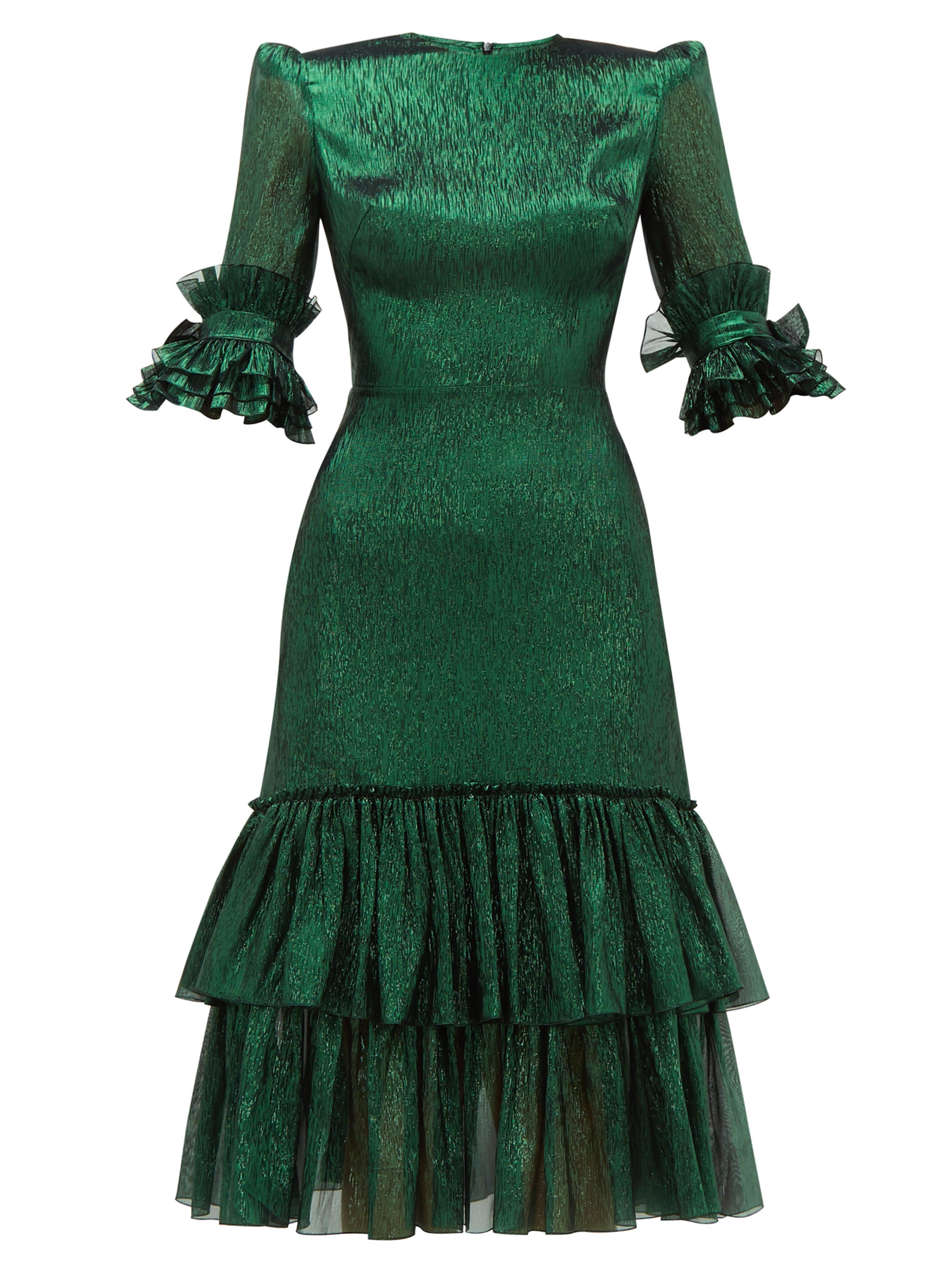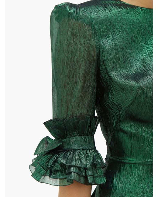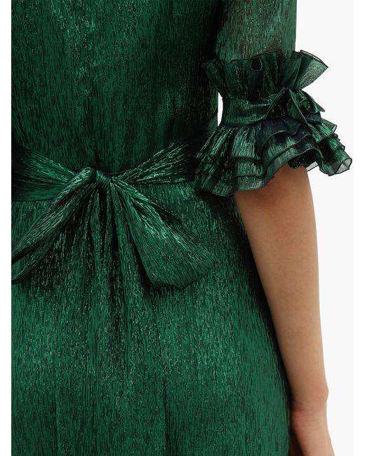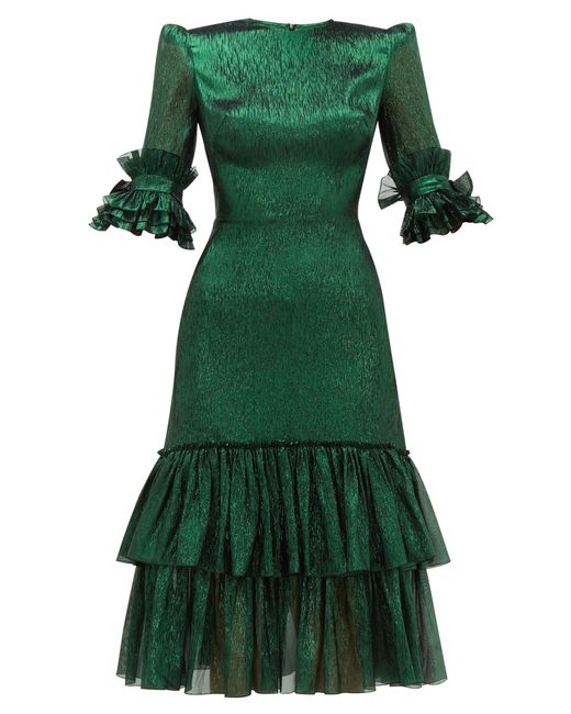 The Vampire's Wife's green The Veneration dress is crafted from green silk-blend lamé which shimmers and appears fluid as it catches the light. It features defined padded shoulders which are balanced by the slender waist and is accented by charming bows on the ruffled, tiered cuffs. Wear it with a structured bag and platform sandals for an enchanting impression. 56%SILK 44%POLYESTER.