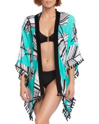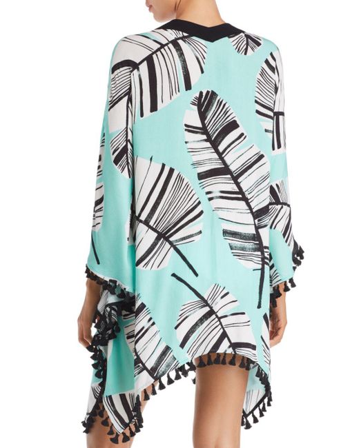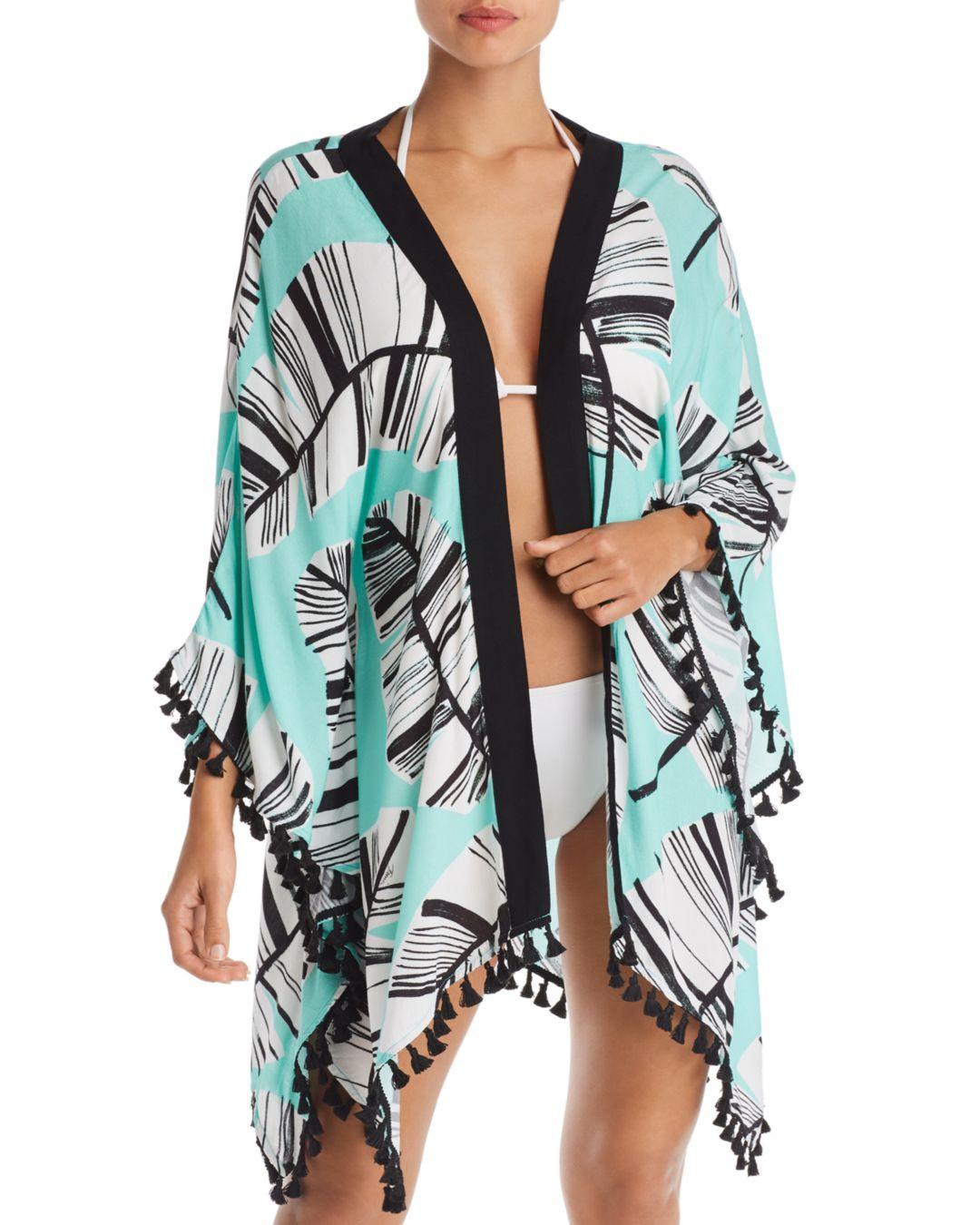 Open-front style. Solid-colored borders. Contrast tassels at hem. Palm print. Available in one size. 80% nylon/20% elastane. Machine wash, line dry. Colour: multicolour