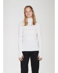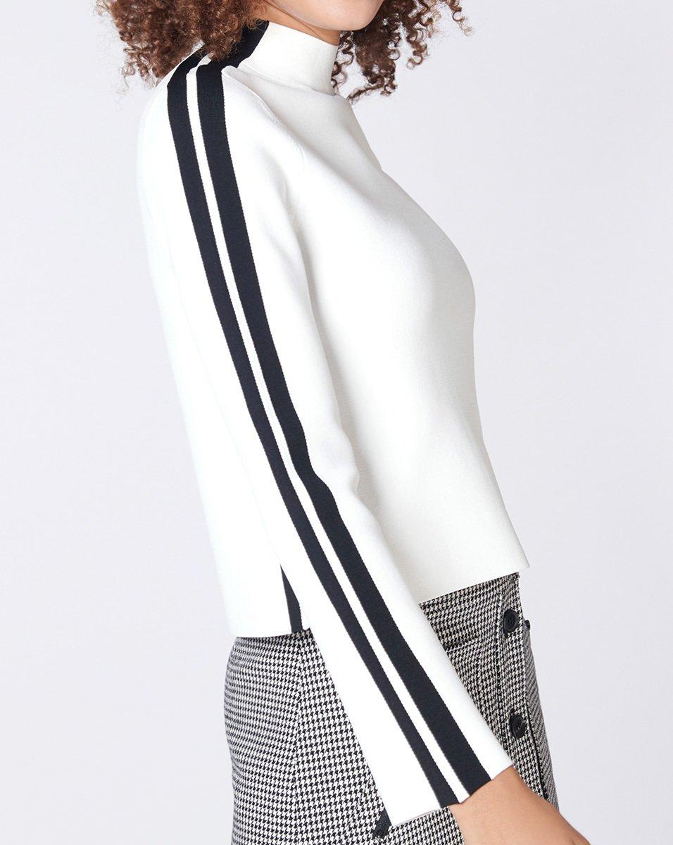 Sporty racer stripes and a minimalist slant set the Retha Jumper apart from the rest. This stretch silhouette is designed with a mock neckline. Style it with a coordinating pant or mix it up with a floral skirt. Colour: white