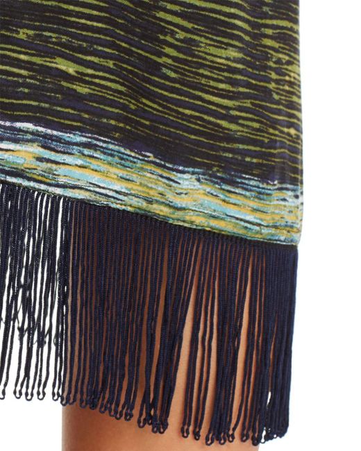 Fits true to size, order your normal size. Model measurements: 5'10" height, 33.5" bust, 23.5" waist, 34.5" hips, wearing a size o/s. Ties at waist. Allover abstract stripe print. Solid fringe trim. Available in one size. 100% rayon. Hand wash. Colour: green
