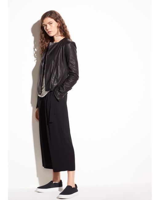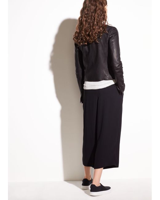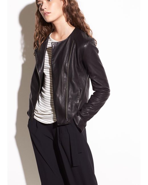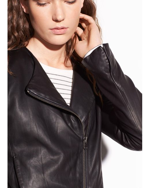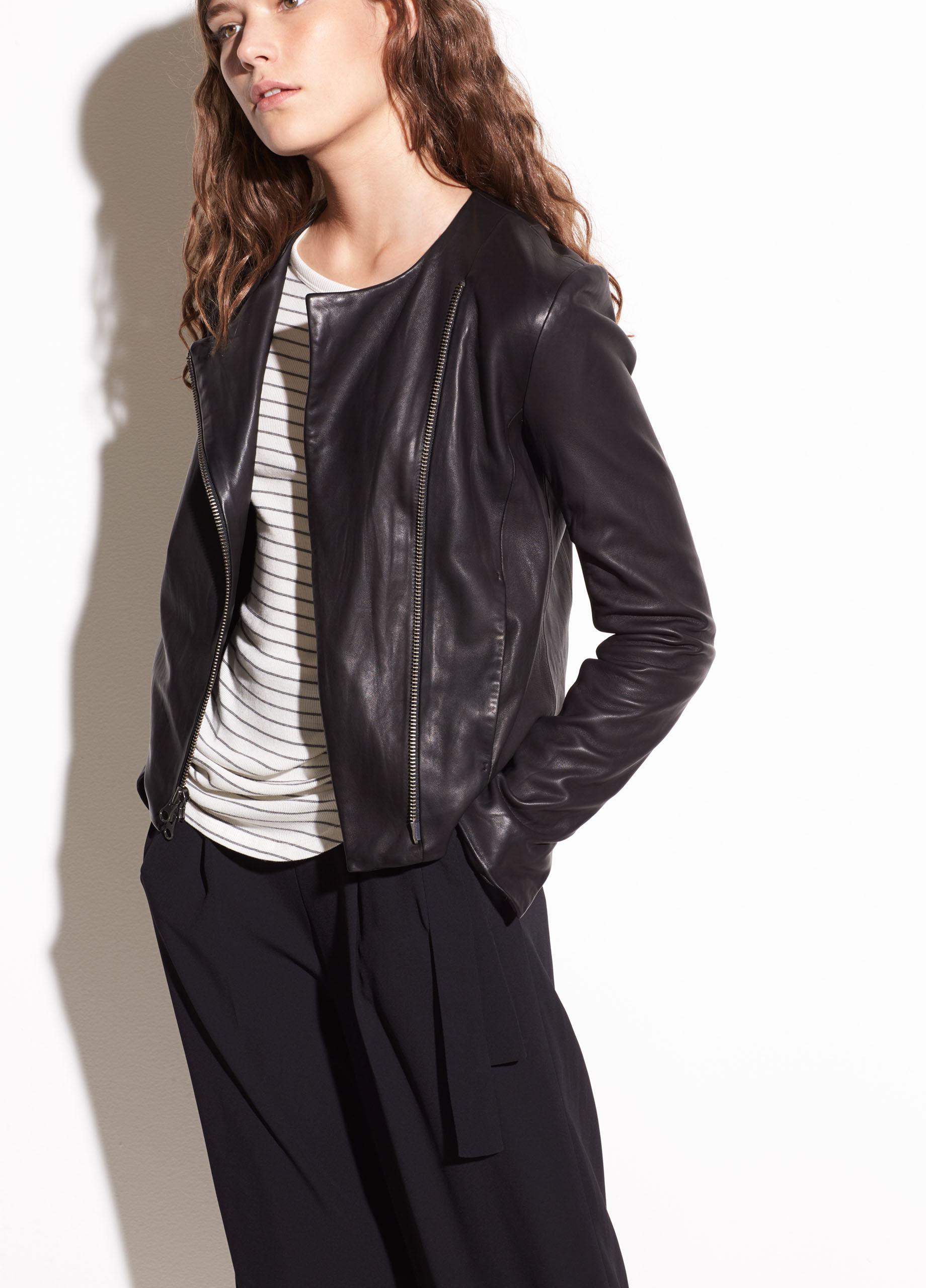 Crafted from buttery washed-leather, the cross front jacket is a brand signature. It has a simple shape and streamlining on seam pockets. Colour: black
