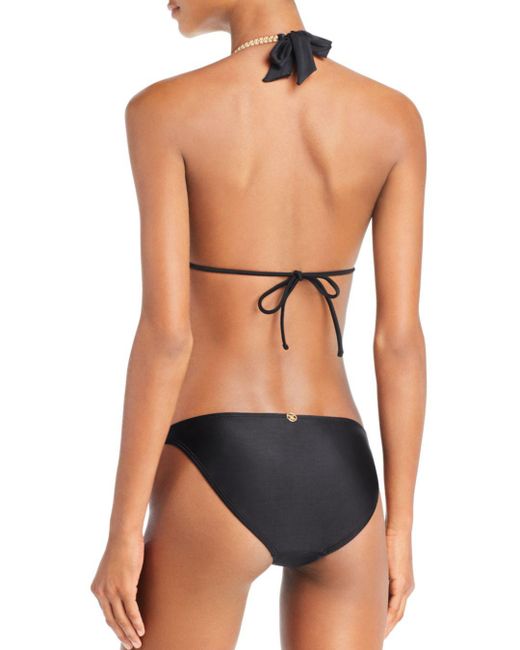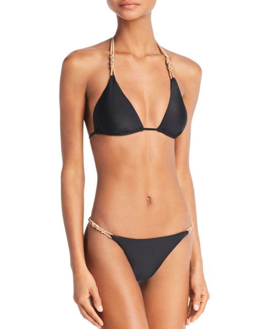 Swimwear sizing fits smaller than apparel sizing, order one size up for more coverage. Model measurements: 5'10" height, 33.5" bust, 23.5" waist, 34.5" hips, wearing a size small. Bunjee rope halter ties at back neck, sliding triangle cups. Ties at back, removable soft cups. Polyamide/elastane. Hand wash. Made in brazil. Colour: black