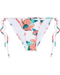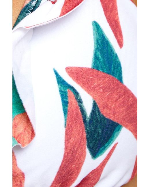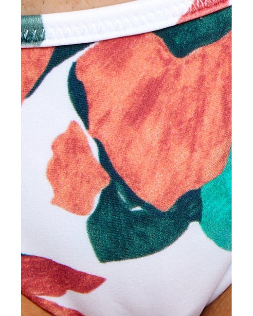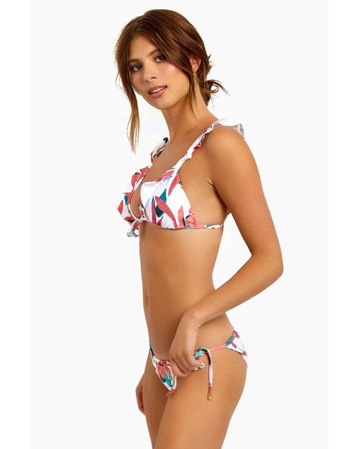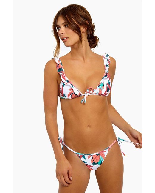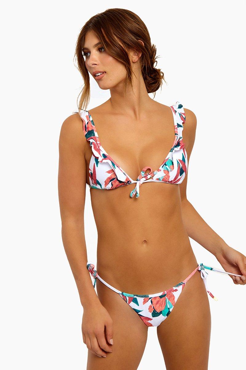 STYLE: Bright white V-neck ruffle front tie triangle bikini top in muted red and green floral print. Triangle cups with slight ruching at the bottom hem and deep-V neckline flatter your bust. Front knot can tied in a bow for a feminine look, pairing perfectly with the other romantic aspects of the bikini top like the adjustable ruffled shoulder straps. Thin, hardware-free back band creates an easy pull-over style perfect for laid-back beach days. Removable pads allow you to wear this bikini top as a bralette, or with extra padding for smoothing and shaping. Pair with the ViX Swimwear Bluebell Tie Side bikini bottom in bluebell. CARE: Hand wash in cold water with gentle detergent and lay flat in the shade to air dry. Lycra blend. Colour: multicolour