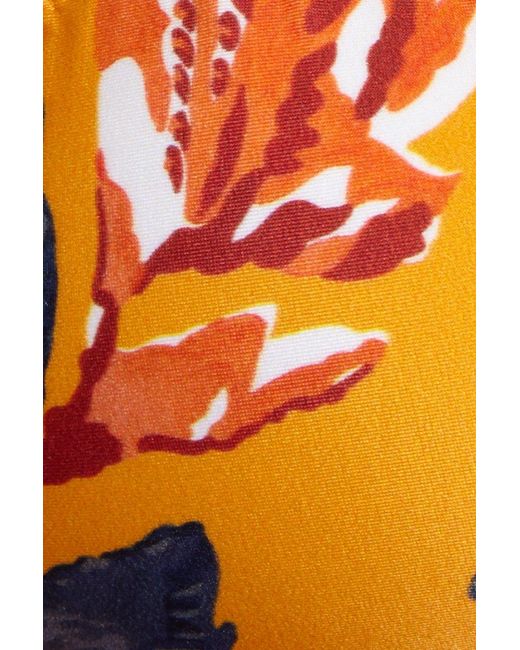 STYLE: Warm orange triangle bikini top in tropical floral print inspired by the Caribbean. Silky Lycra stretch fabric accented by lettuce trim for an overall feminine look. Adjustable cups can be scrunched up to expose more skin, or can be stretched out for a fuller coverage look. Adjustable halter straps offer extra bust support and tie behind the neck for the perfect amount of lift. Ties at the centre back can be tied as loose or tight as needed for the perfect fit. Removable pads allow you to wear this bikini top more as a bralette style, or with additional padding for smoothing and shaping. Pair with the ViX Swimwear Ripple Tie Full bikini bottom in Tulum. CARE: Hand wash in cold water with gentle detergent and lay flat to air dry. 84% polyamide, 16% elastane. Colour: yellow