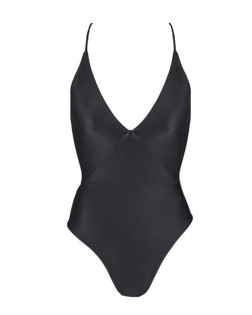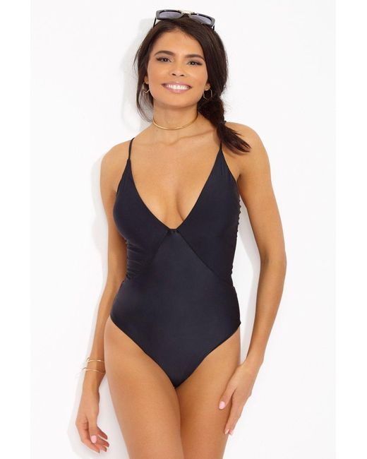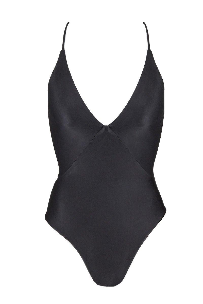 STYLE: Deep v-neck one piece swimsuit in classic black. Diagonal seams at the front define your waistline and create the appearance of an hourglass figure. Thin straps cascade over your shoulders and meet at the back in a crisscross design. Corset-style adjustable lace-up detailing at back adds a super sexy finish that shows some skin. Strings at the back are accented with beads for a touch of on-trend metallic detailing. Moderate rear cut shows off your curves while providing cheeky coverage. Pair with a wide-brimmed sun hat and a statement clutch for a classic beach look. CARE: Hand wash in cold water with gentle detergent and lay flat to air dry. 84% polyamide, 16% elastane. Colour: black