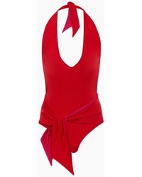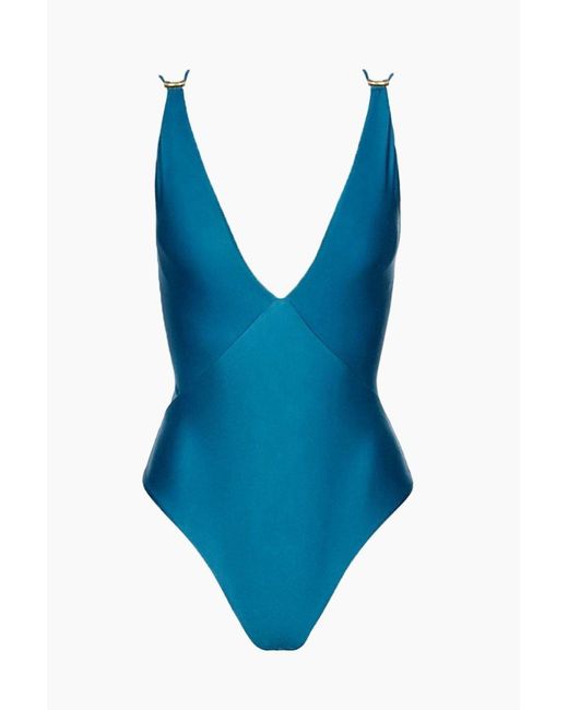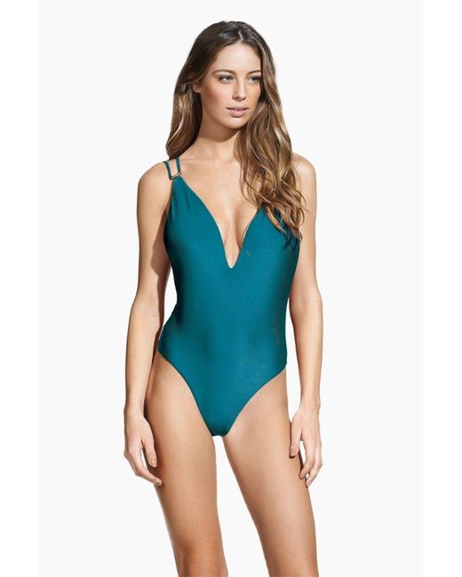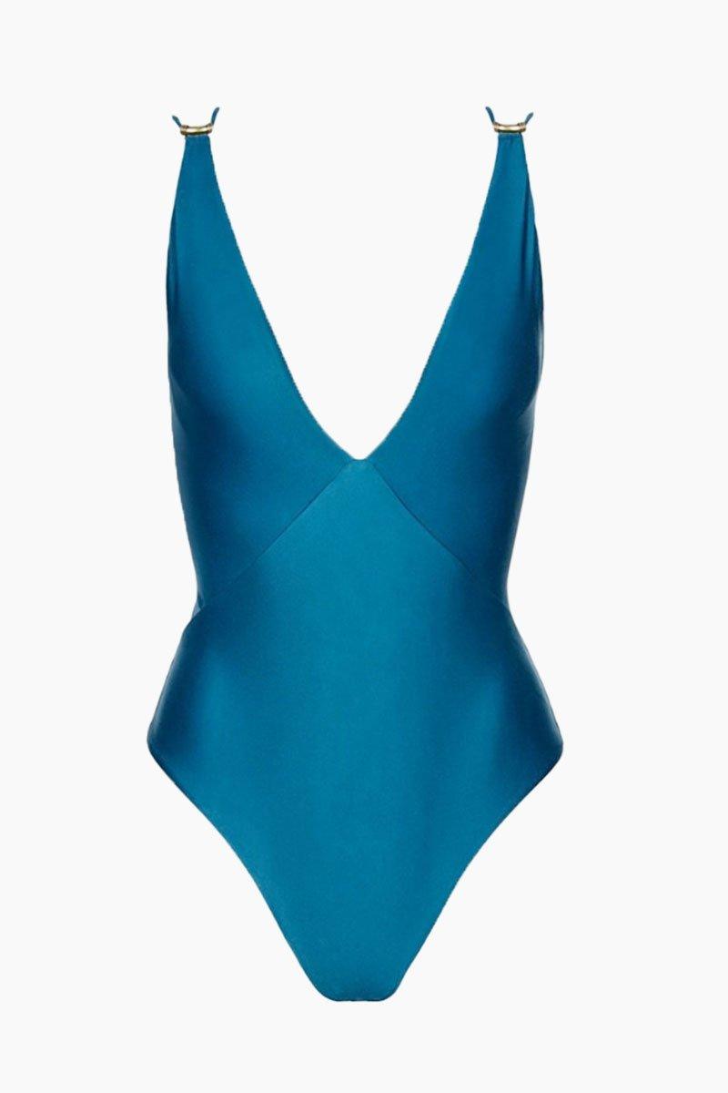 STYLE: Deep V-neck one piece swimsuit in imperial blue with a hint of sheen. Diagonal seams at the front define your waistline and create the appearance of an hourglass figure. Thin straps cascade over your shoulders and meet at the back in a crisscross design. Adjustable lace-up detailing at back adds a super sexy finish that shows some skin. Strings at the back are accented with beads for a touch of on-trend metallic detailing. Moderate rear cut shows off your curves while providing cheeky coverage. Pair with a wide-brimmed sun hat and a statement clutch for a classic beach look. CARE: Hand wash in cold water with gentle detergent and lay flat to air dry. 84% polyamide, 16% elastane. Colour: blue