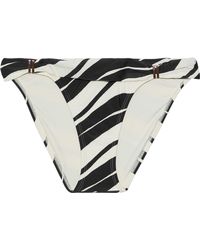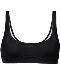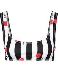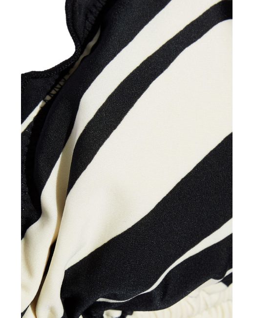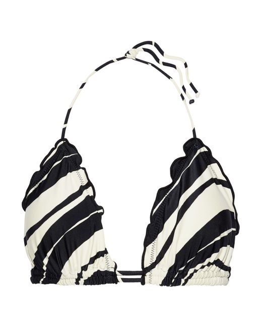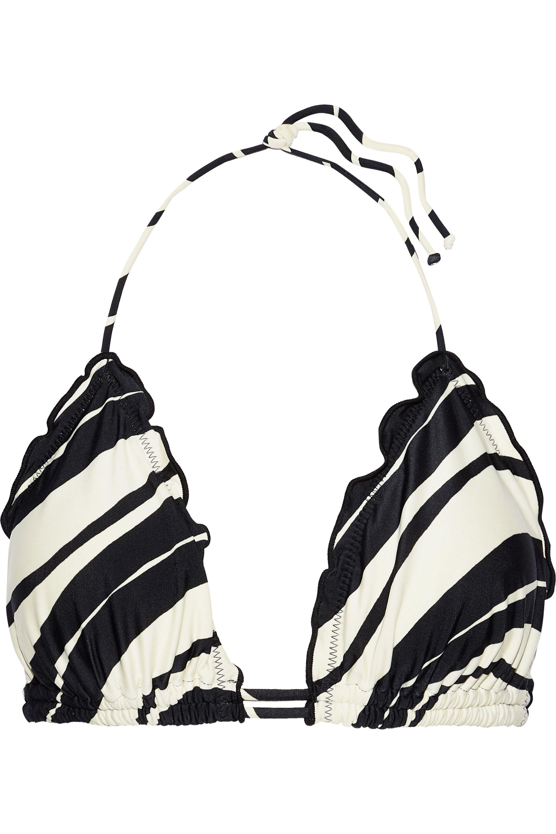 Bikini top Triangle cup bra Striped Stretch-polyamide Ruffled trims Ties at neck and back Fully lined Hand wash. Imported Sunscreen and chlorine can discolor swimwear. 84% Polyamide, 16% Elastane. Colour: black