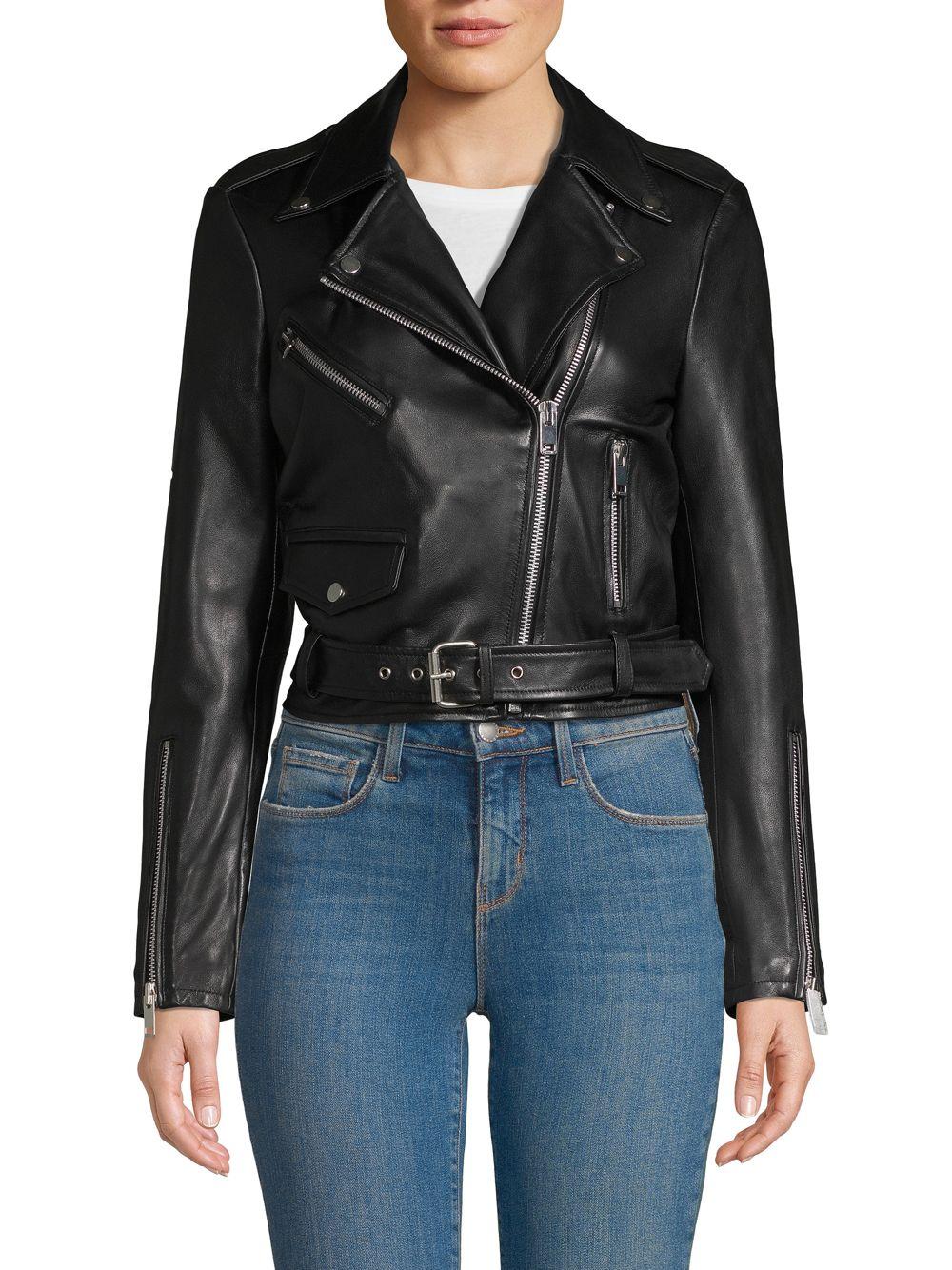 Go to Saks OFF 5THLong sleeve leather moto jacket with an asymmetric front zip and a belted waist. Notched lapel. Long sleeves. Zip cuffs. Asymmetric zip front. Waist flap pocket and zip pocket. Belted waist. Leather. Dry clean. SIZE & FIT. Slim fit. About 20.75" from shoulder to hem. Model shown is 5'10" (177cm) wearing US size Small. Colour: black