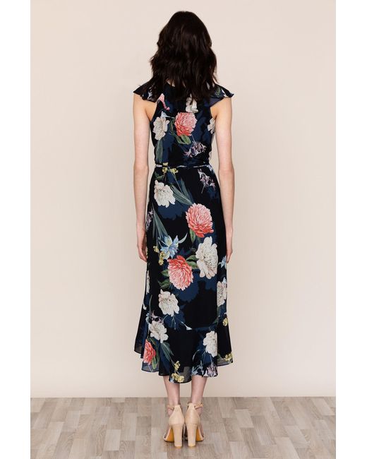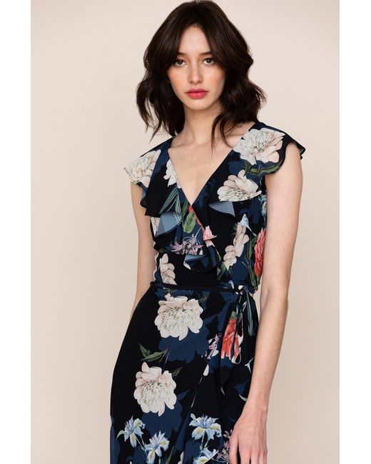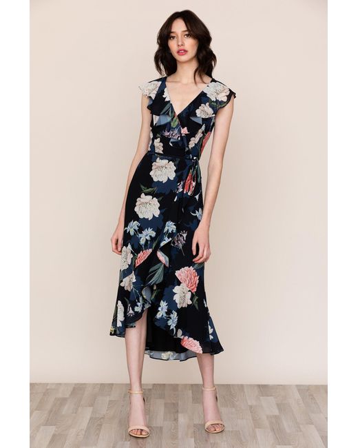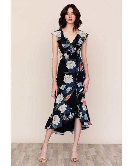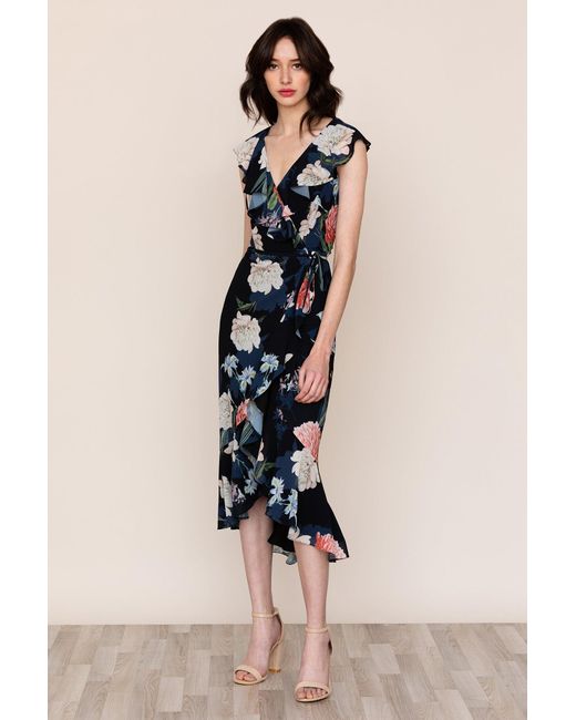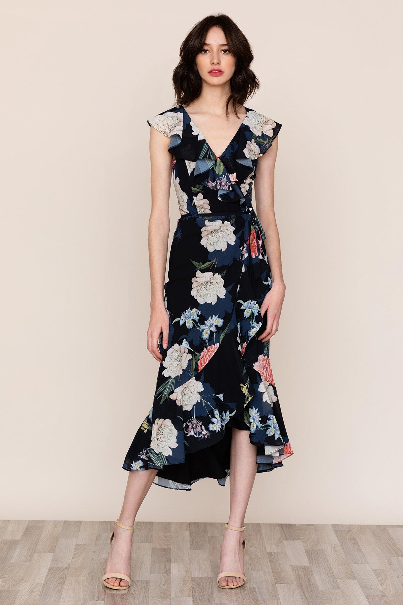 NANTUCKET DRESS Be ready for any occasion in our Nantucket Dress. Details include wrap silhouette with ruffle trim and self tie at waist. Lined. Model is wearing size small *Dry Clean Only FABRIC: Polyester LENGTH: Top of shoulder to hem 51". Colour: black