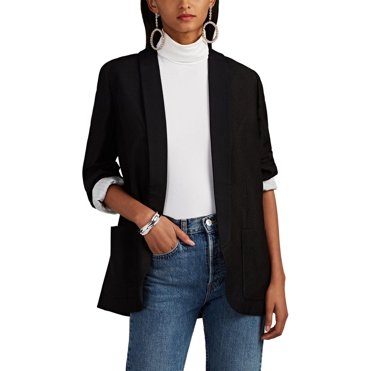 Zadig & Volatire's Verdun Bright open-front blazer is composed of black plain-weave detailed with metallic fibres for a shimmery effect. Open front. Centre vent. Shawl collar. Patch side pockets. 28 centre back length (approximately). Lined. Pocket at interior. 97% viscose, 3% polyester. Body lining: 100% viscose. Sleeve lining: 50% acetate, 50% viscose. Collar: 56% viscose, 40% cotton, 4% elastane. Dry clean. Imported. Zadig & Voltaire Women's Verdun Bright Metallic Blazer - Black Size 34 FR A great designer gift. Stay on top of Spring trends and shop Zadig & Voltaire at Barneys Warehouse. Colour: black