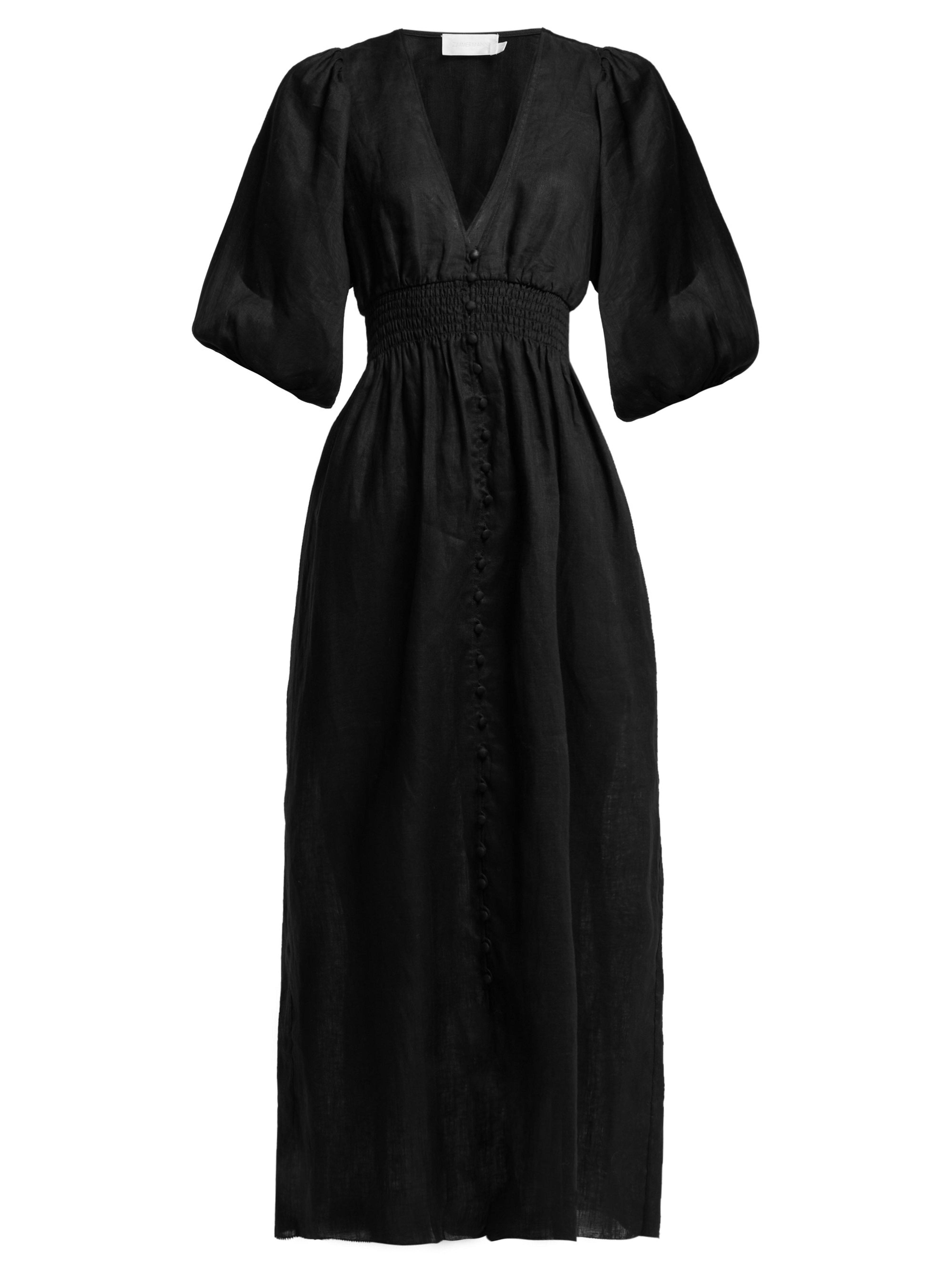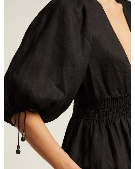 Zimmerman's bohemian aesthetic takes its design cues from the 1970s wardrobe of Anjelica Huston for Resort 2019 and the result feels deeply romantic. This black linen Primrose dress is crafted from lightweight linen – ideal for warm-weather dressing – and shaped for a relaxed fit with a flattering V-neckline and shirred waistline panel, then finished with elasticated drawstring sleeves. Style it with a basket bag and sandals for a whimsical daytime look. 100% Linen. Colour: black
