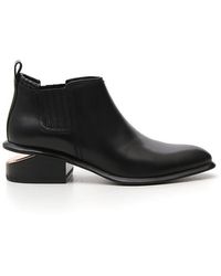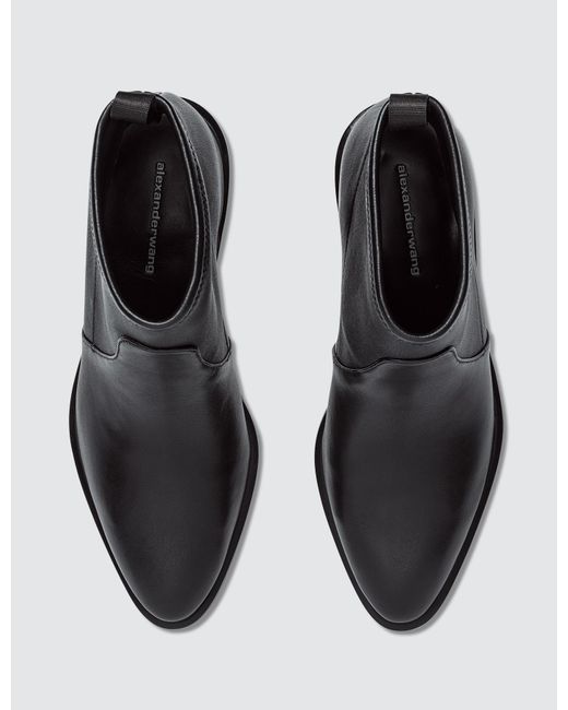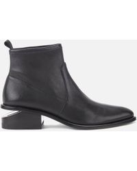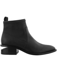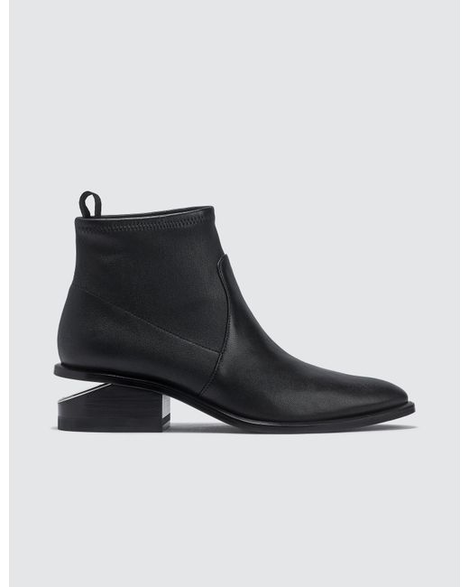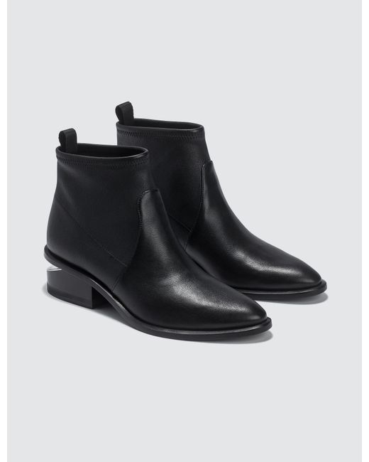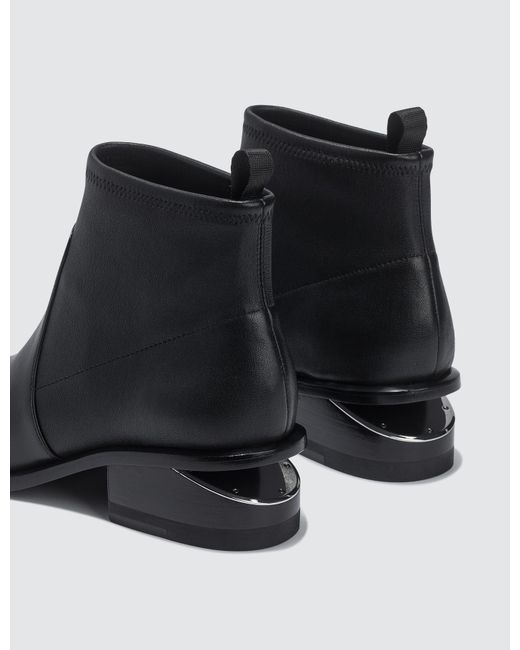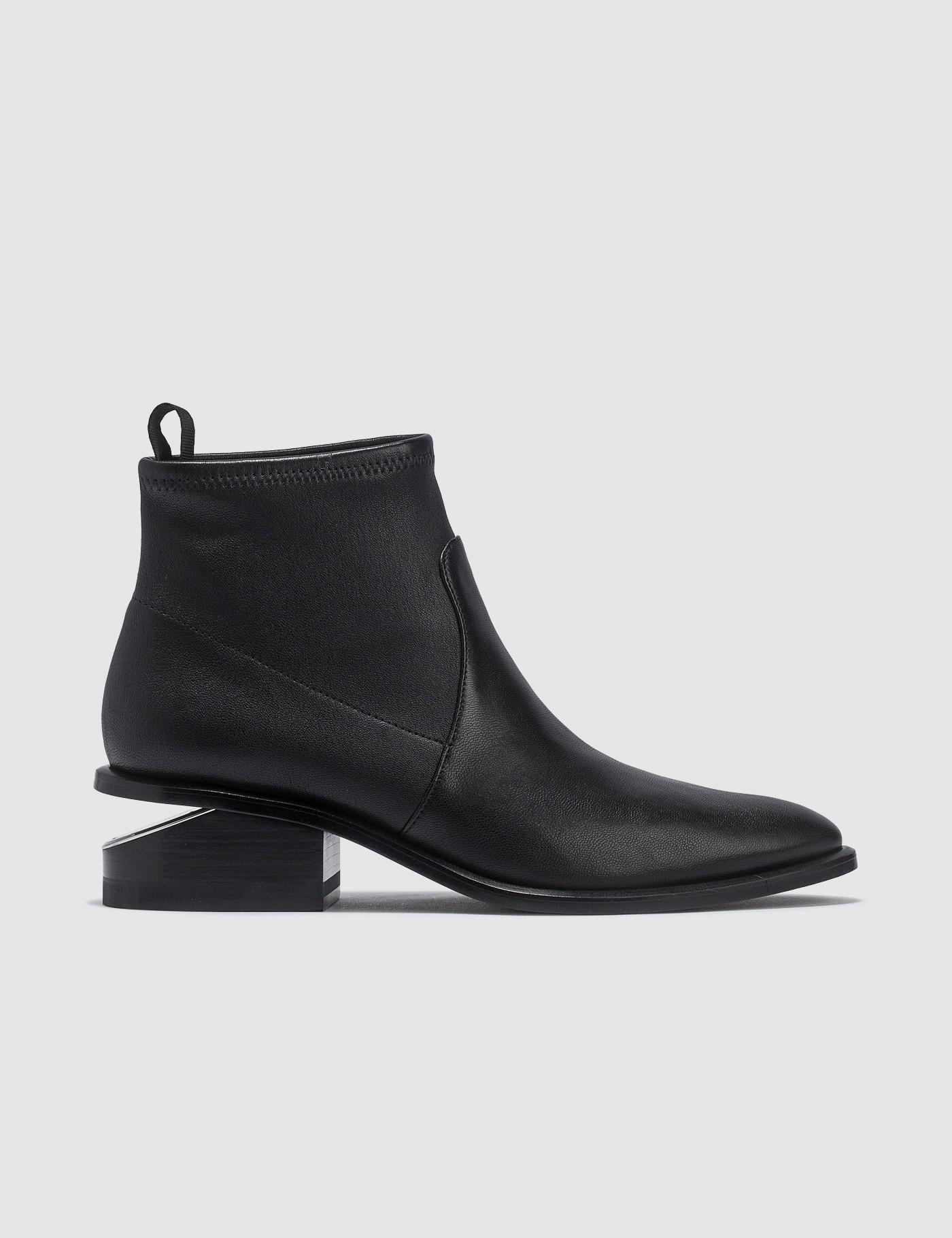 Alexander Wang - Kori Stretch Bootie- Leather ankle boot- Pointed-toe shoes- Stretch gore for easier wear- Leather shoe loop at heel for easy take off and put on- Wrapped leather stacked heel and outsole- Cut out heel with shiny metal plate- Color: Black- 100% Sheep Nappa- See more Boots". Colour: black