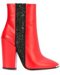 Jilly Boots in intarsia signature stripe, brings glamour to the party with an equestrian twist. The pointed-toe silhouette features adjustable leather straps that wrap around the boot and buckle with silver toned hardware, inside zip closure, stacked heel, and leather sole. Made in Italy.