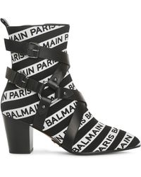 The designer infuses Balmain's signature glamour and lavish embellishments into classic wardrobe staples, presenting a collection of wearable yet striking silhouettes for the fashionable modern woman. These Jilly booties are elevated by an all-over logo print and black leather straps. Featuring an ankle length, a pull tab at the rear, a side zip fastening, a strappy design, a high block heel and an all-over logo print. Material:Cotton/Leather.