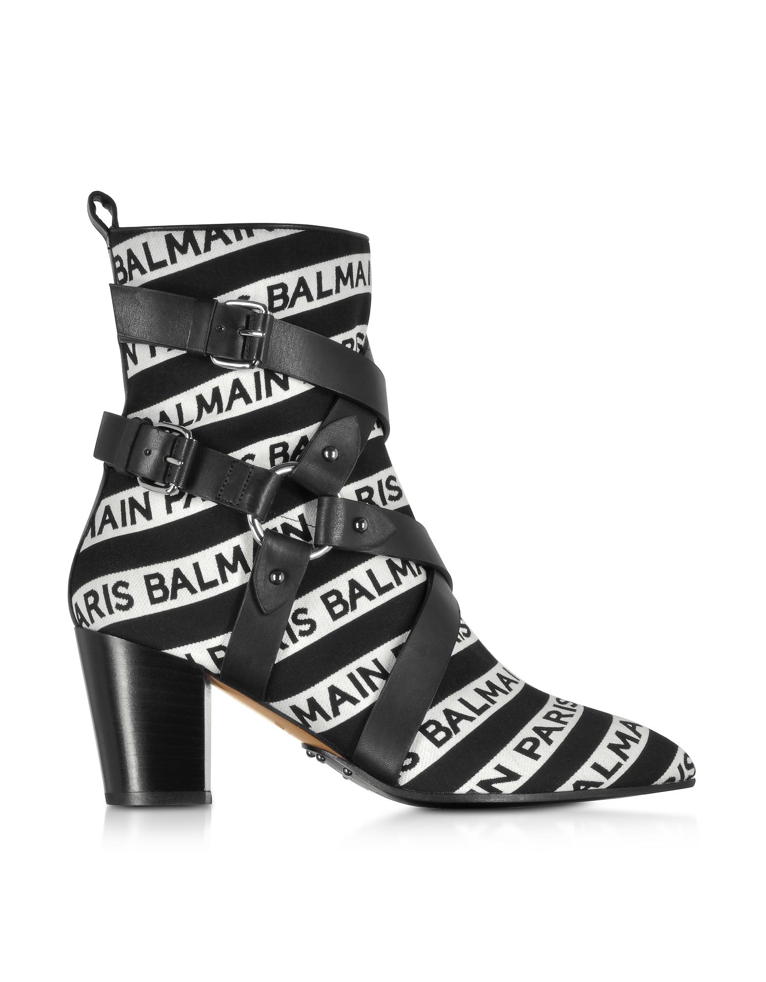 Black and white stripe logo coated fabric boots from Balmain. The boots have a 80mm heel, a pointed toe and black leather harness detail and a block heel, zip closure at the side. True to size. Leather sole. Made in Italy. Colour: black