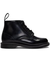 Women's 'Emmeline' black leather boots from English subculture purveyors Dr. Martens. Crafted with smooth polished black leather uppers, the 'Emmeline' boots feature a lace-up fastening with metallic eyelets, a rounded toe, and Dr. Martens' signature air cushioned sole which is Goodyear-welted and heat sealed to the upper. Complete with Dr. Martens' 'Air Wair' woven brand tab to the heel. L.R. Upper: Leather. Sole: PVC.