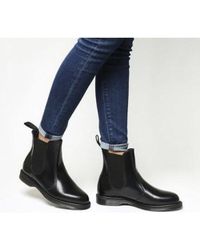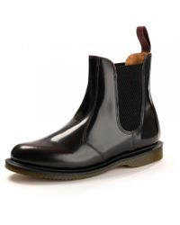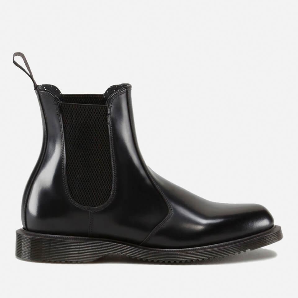 Simplistic yet stylish, the Dr. Martens Women's Kensington Flora Chelsea Boots - Black have a polished, smooth leather upper that is accentuated with elasticated side panels for ease of use. Goodyear welted for a long-lasting finish, the boots are set upon a durable, air-cushioned sole that supports the foot for a comfortable fit. L.M. Dr. Martens Women's Kensington Flora Chelsea Boots Leather upper Elasticated side panels Almond toe Heel tab Goodyear welted Air-cushioned sole Pull on style. Leather upper, PVC sole.