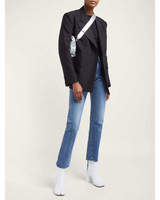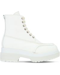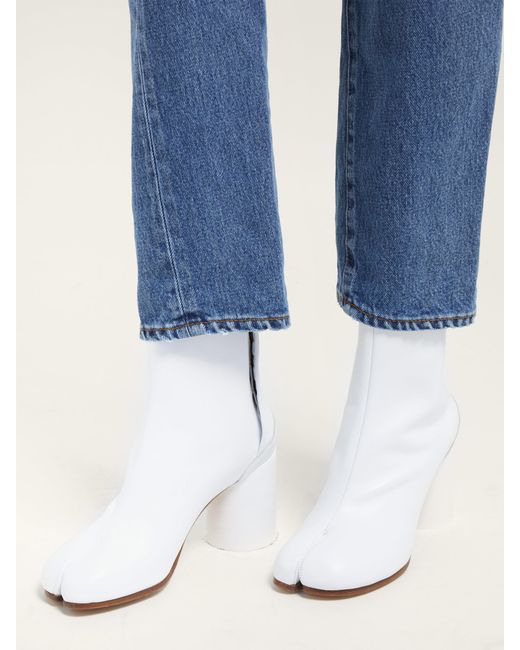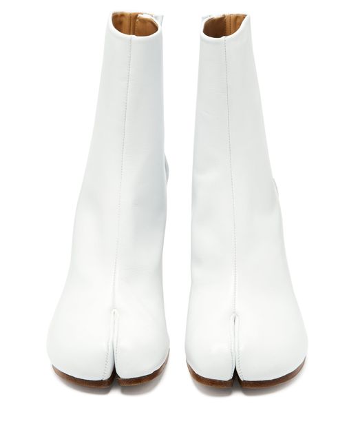 Maison Margiela looks to traditional Japanese Tabi socks to create these white leather split-toe ankle boots – a signature style for the house. Elevated by a chunky cylindrical heel, they have concealed hook closures down the side of the ankle and the soles are lined in beige leather. Style them with a sharp black blazer and blue denim jeans for a directional take. LEATHER UPPER, LEATHER SOLE. Colour: white