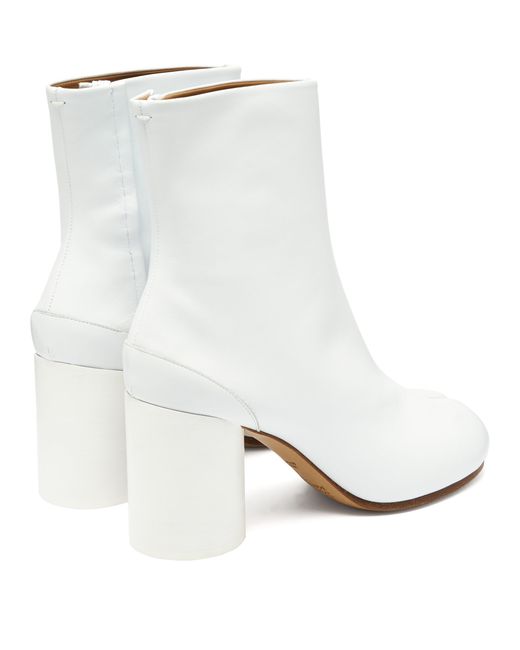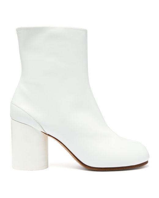 Maison Margiela's iconic Tabi ankle boots are inspired by the traditional Japanese socks of the same name that have been worn with thonged footwear since the 15th century. Constructed from smooth white leather, this classic pair boasts the Maison's exposed white stitching at the back of the ankle. Featuring a concealed side zip fastening, a branded insole, a mid high block heel and the signature cleft toe. Material:Leather.